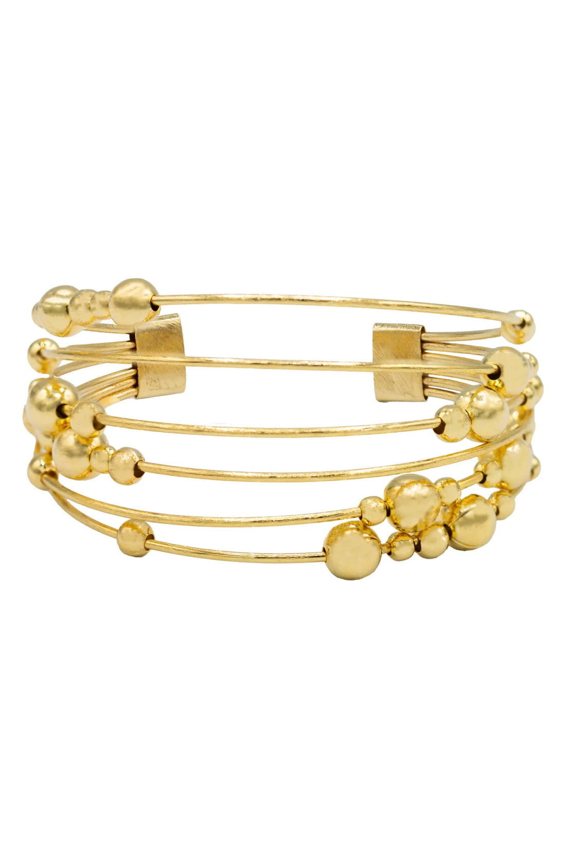 This striking 18K gold-plated cuff showcases a contemporary open-wire design, accented with free-moving gold balls...