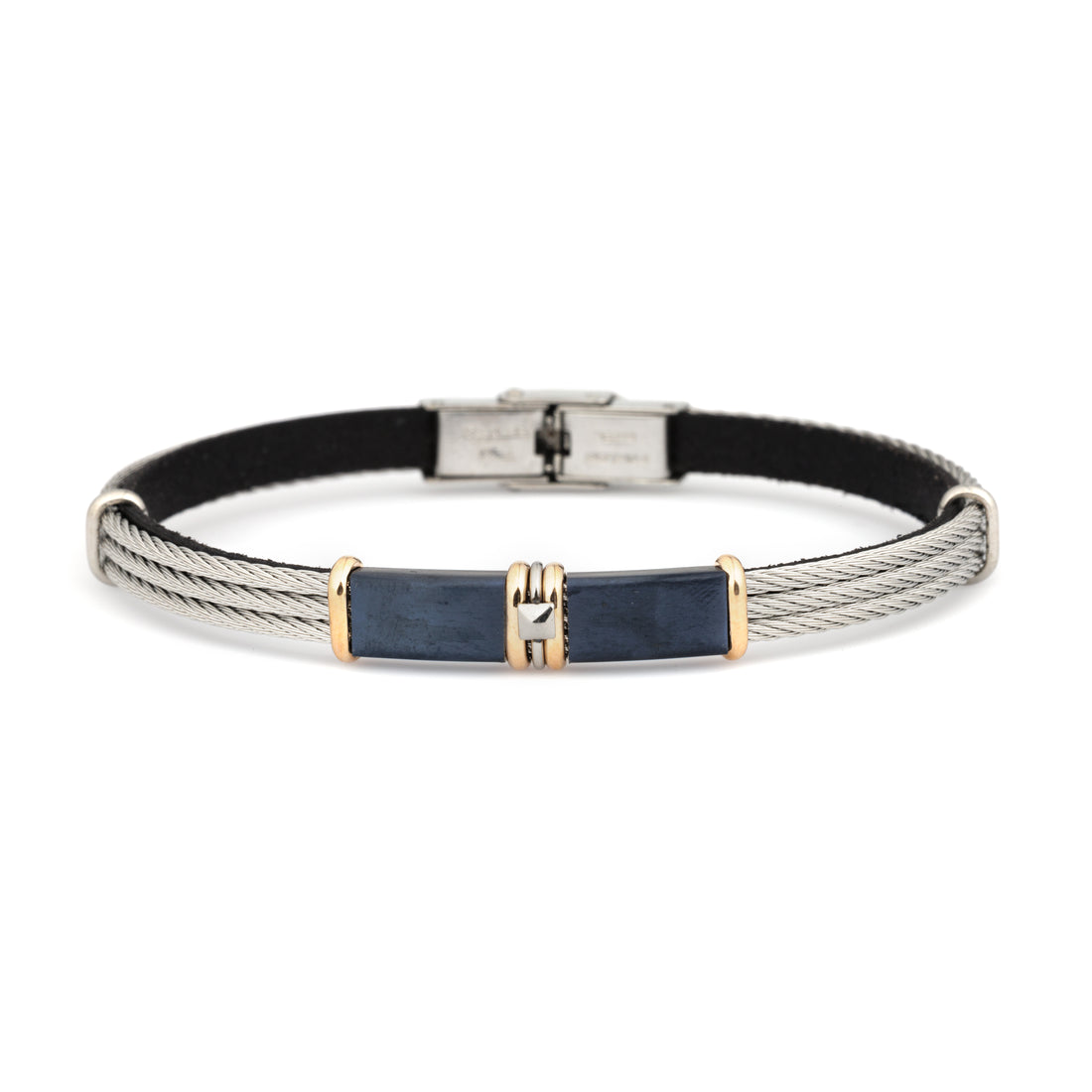This bracelet features an oxidized brush finish, creating an antique look. The gold accent detail...