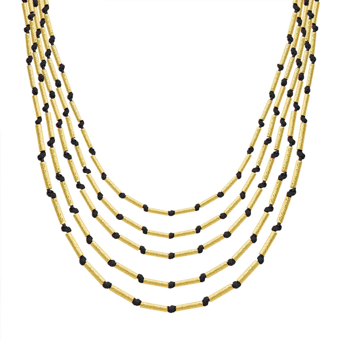 Details: 18k gold plated cylinder beaded multi strand necklace strung together with colored string. -Measures...