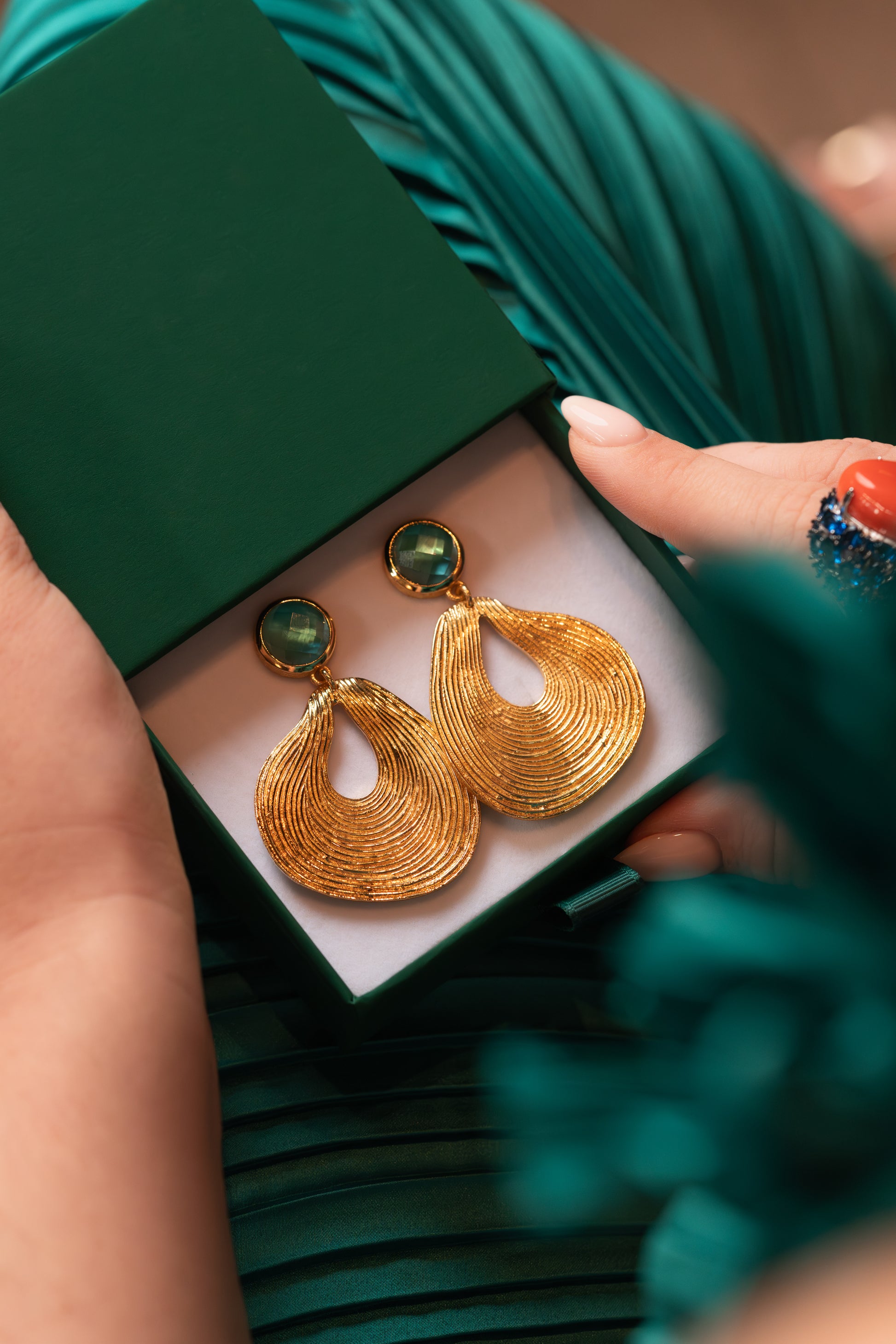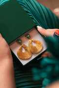 -18K gold plated earrings with a stone post and a textured drop