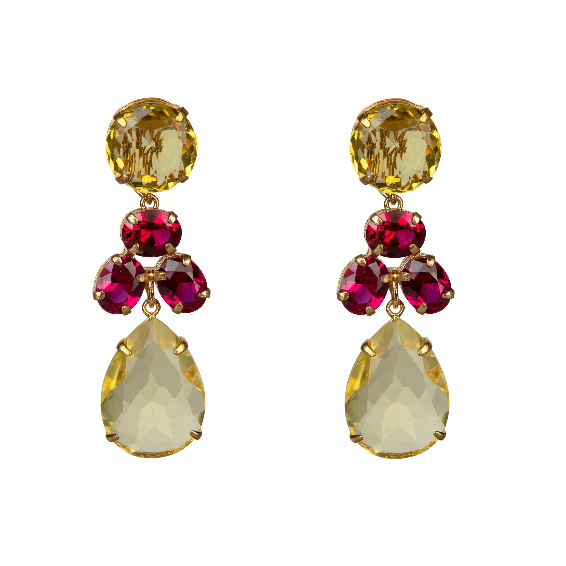 Description: A four-way interchangeable design crafted in 14k gold-plated. These luminous earrings pair vibrant fuchsia quartz with glowing lemon quartz, capturing the warmth and richness of the earth in every angle. One can wear them as bold drops or as refined studs—the removable elements let you shift effortlessly from everyday elegance to full statement energy.