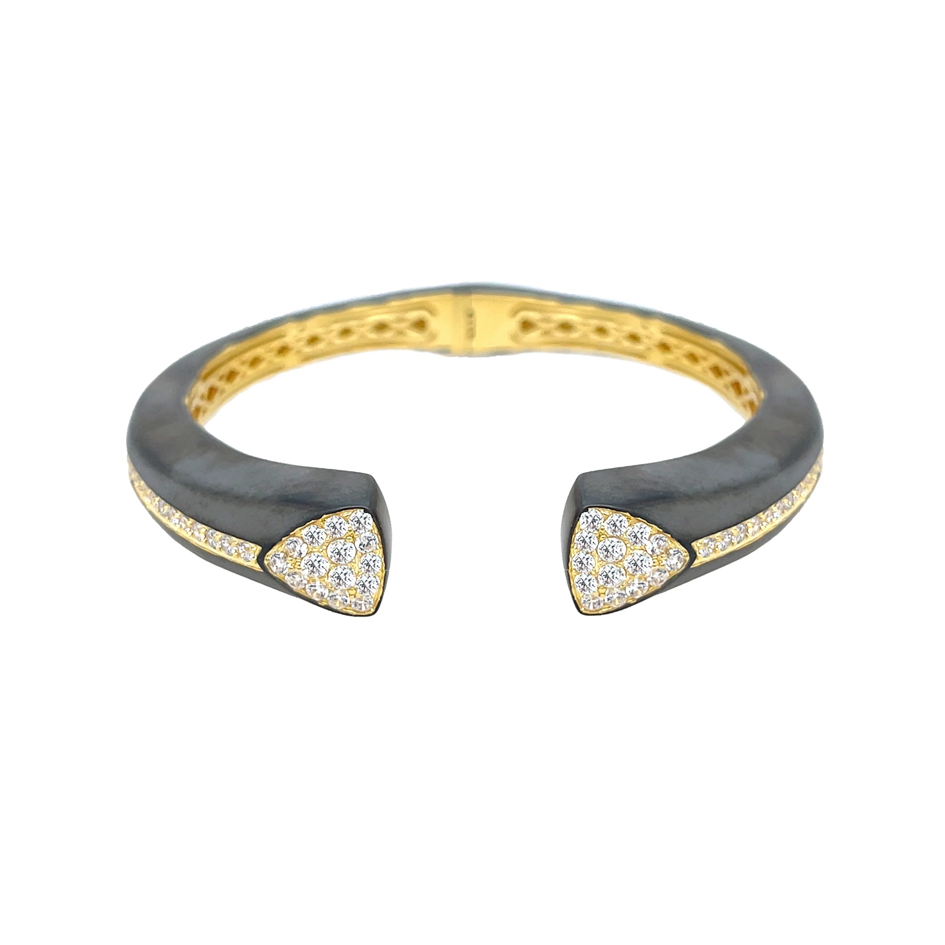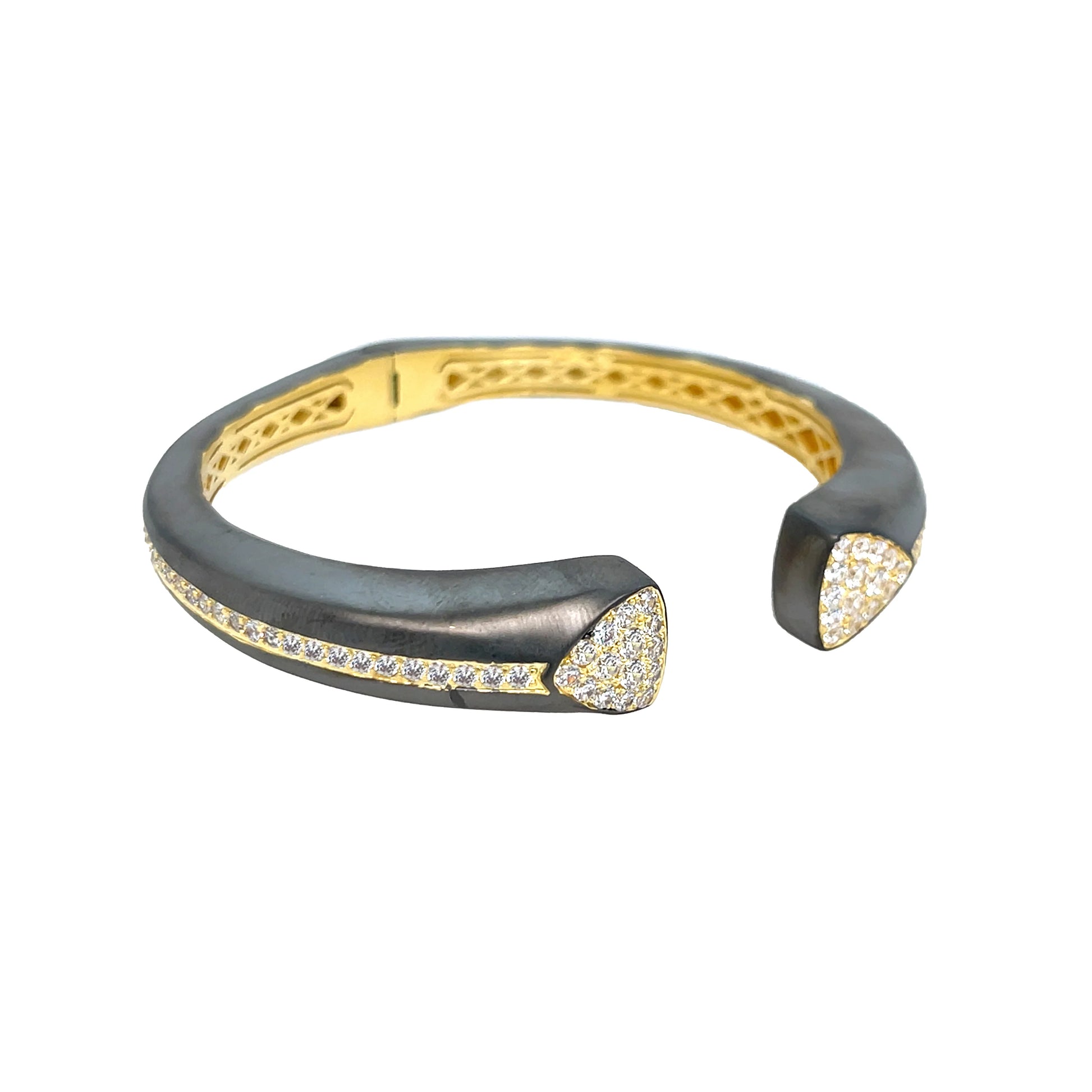 Featuring sparkling pave cubic zirconias, this bracelet provides a modern and edgy look. Its unique hinged closure ensures a secure fit, making it a must-have bangle.
